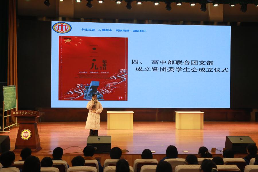 在12月9日这承载了民族精神的特殊日子,王敏蓉主任郑重宣布星空在线登录官网高中部联合团支部正式成立,随之成立的还有高中部第一届团委学生会。高中部学生发展中心朱颖智老师宣读了学生干部名单及其职责,学生干部代表刘榆煊发表了履职誓言。