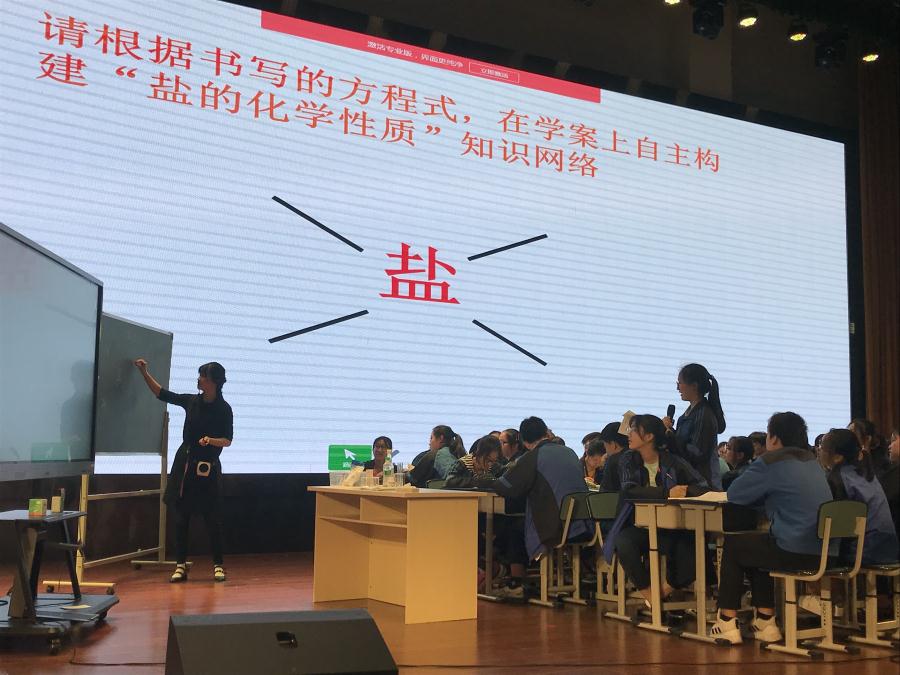 首先,由星空在线登录官网的龚芮琦老师以《盐的复习》这一课题内容进行现场课例展示。龚老师以生活中常见的物质分类引导学生回忆盐的结构特征,复习常见盐的基本用途,根据常见盐的反应来让学生构建知识网络,复习复分解反应以及酸碱盐的综合应用。复习了常见盐氯化钠、碳酸钠、碳酸氢钠和碳酸钙的性质和用途;复分解反应的特征和发生条件;以及反应后溶液中溶质成分探究问题。在本节课的教学设计中,体现了教-学-评一致性,加强了学生知识过手,提高复习效率。