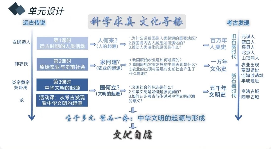 在抽到“中华文明的起源与形成”这个选题后,晋云萍老师组织大家对这个题目进行解读和研讨,并从核心素养整体视角出发,结合新课标对新旧教材的变化进行解读,精准把握各教学环节之间的内在联系与逻辑顺序。胡敏霞老师提出以“科学求真、文化寻根”为主题进行单元整体设计。黄雯老师发挥自身考古学背景优势收集教学资源并做了充分的学情调查。李然老师以我校学科特色活动课为蓝本,修改完善了本单元的教学设计。