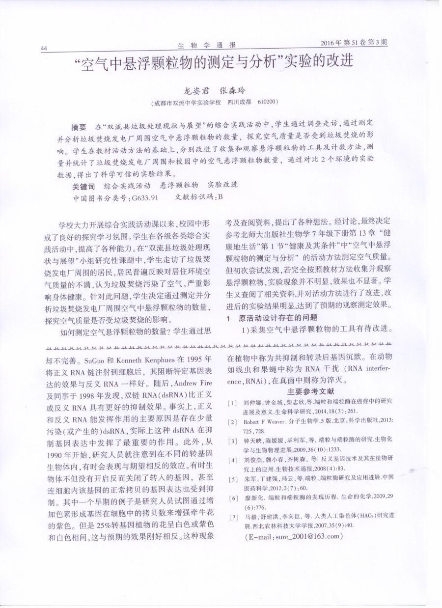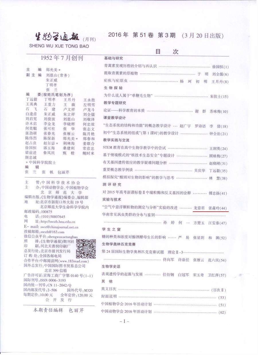 热烈祝贺我校龙姿君、张淼玲两位老师的论文《“空气中悬浮颗粒物的测定与分析”实验的改进》,在《生物学通报》实验与技术栏目发表。《生物学通报》是由中国科学技术协会主管,中国动物学会、中国植物学会和北京师范大学主办的全国生物学类核心期刊。