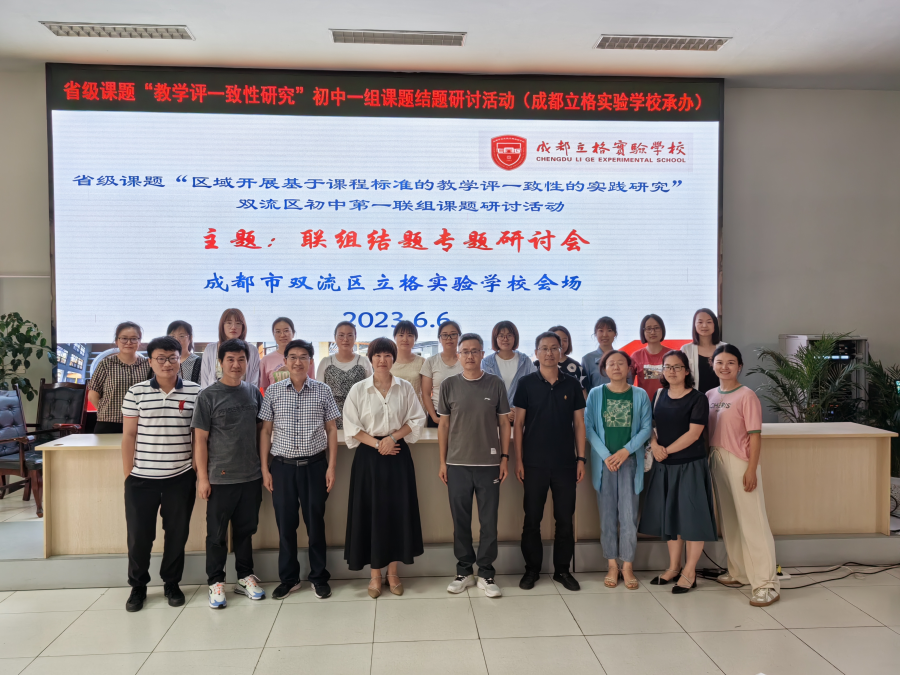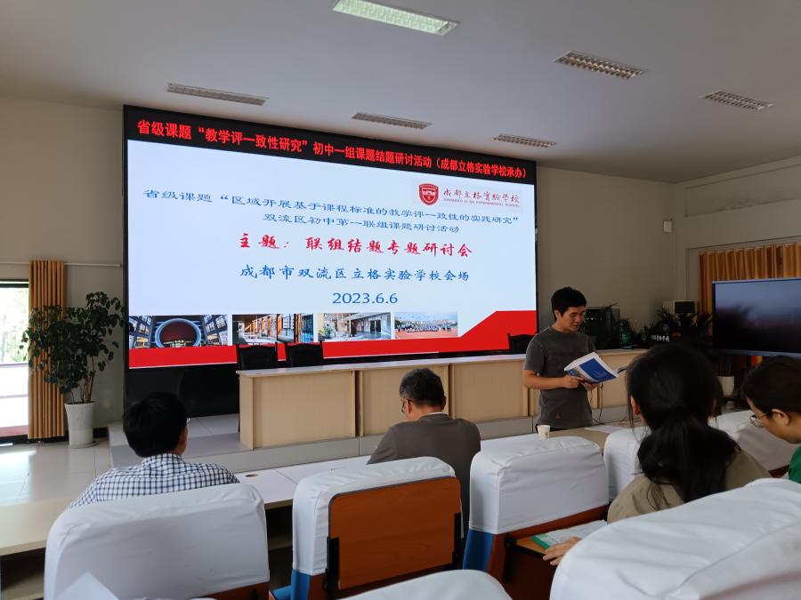 2023年6月6日下午,省级课题“区域开展基于课程标准的教学评一致性的实践研究”双流区初中第一联组课题结题专题研讨会在成都市双流区立格实验学校学术厅举行,会议由成都立格实验学校教学评一致性研究课题组长韩科老师主持,参会人员有双流区教科院教育改革研究中心易恩主任,双流区教学评一致性研究初中第一联组负责人、成都芯谷实验学校教师与课程建设中心李军主任,成都市双流区立格实验学校教科室文传福主任,以及成都立格实验学校、成都芯谷实验学校、西航港一中、西航港二中“教学评一致性研究”科研共同体课题负责人、主研教师。