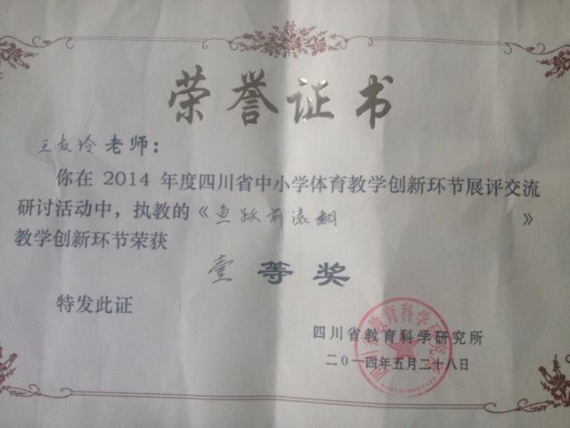 2014年5月25日至27日,由四川省教育科学研究所举办的2014年度四川省中小学体育教学创新环节展评交流研讨活动在遂宁高级实验学校举行。本次大赛从说课、教学创新环节片断展示、专家现场点评三环节进行,评委现场打分。此次活动各地市州高度重视、积极参与,全省21个地市州体育教研员和体育教师1000余人到现场观摩。四川省教科所体育教研员邱永诚老师、成都市教育局体艺卫处吴小刚处长等体育界专家到会参与大赛评比并进行了学术指导。经过各县、市的层层选拔,来自全省21个地市州的52位中小学体育教师参加了本次大赛决赛,我校优秀青年教师王华荣获大赛一等奖。