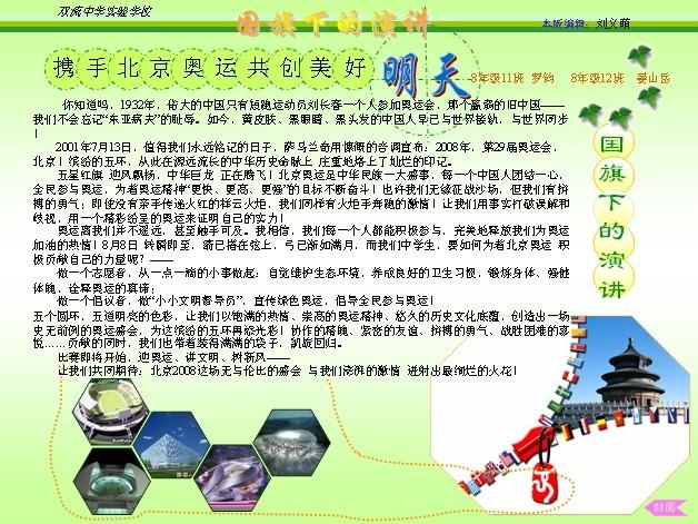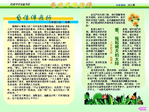 这是我校刘义萌同学制作的电子报刊——国旗下的演讲,收录的是我校同学在国旗下的发言,希望以此激励:努力学习吧!祖国需要我们,世纪需要我们,未来需要我们!