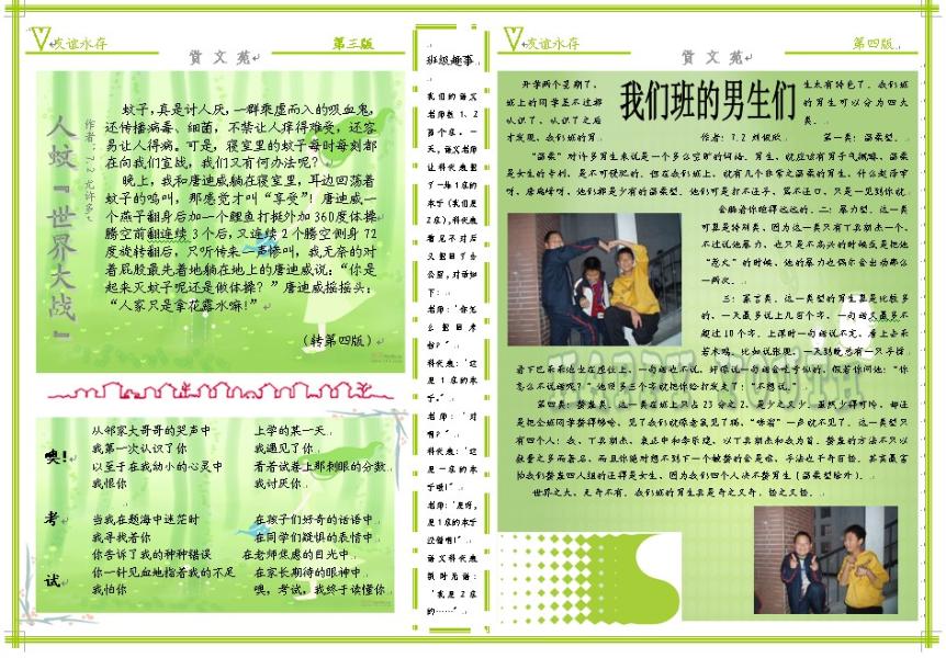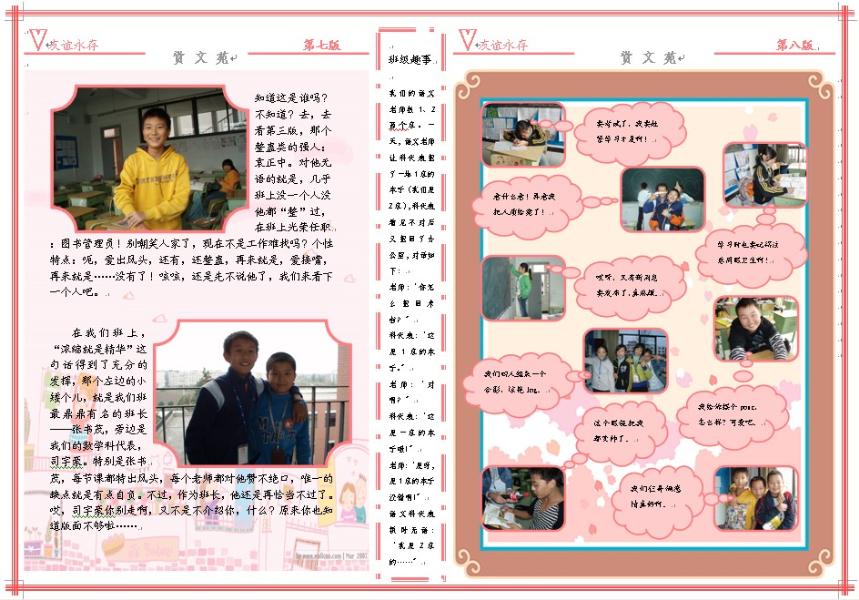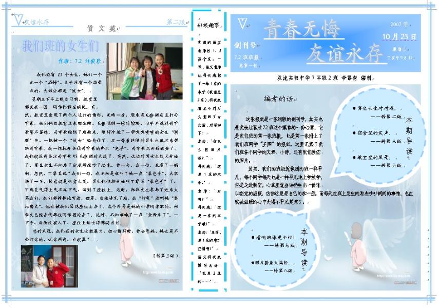 这张报纸是一张绝版的创刊号,其实也是我表达喜欢7.2班这个集体的一份心意,它是我们班的第一张班报,也是第一张附上了我们班同学“玉照”的报纸。这里汇集了我们班各个同学的文章、小诗,还有我们教室的照片。