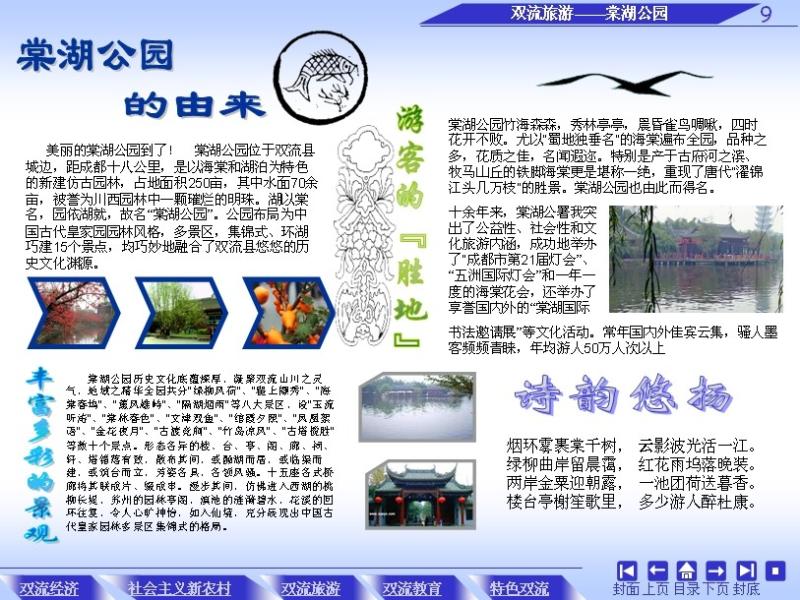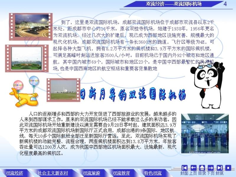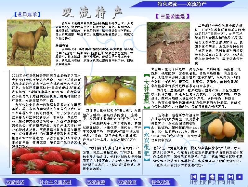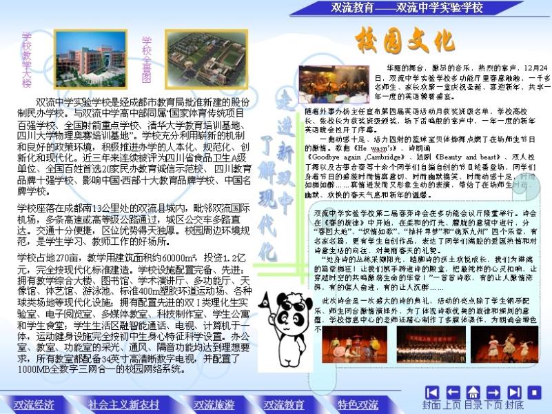 为了体现双流的特色,作品从双流经济,农村教育及双流的特色展开制作,分类说明。选择很多原创素材,部分照片也是自已摄制的。在版式上,采用网上一些优秀作品版式,灵活采用多种模式,使作品丰富多彩。