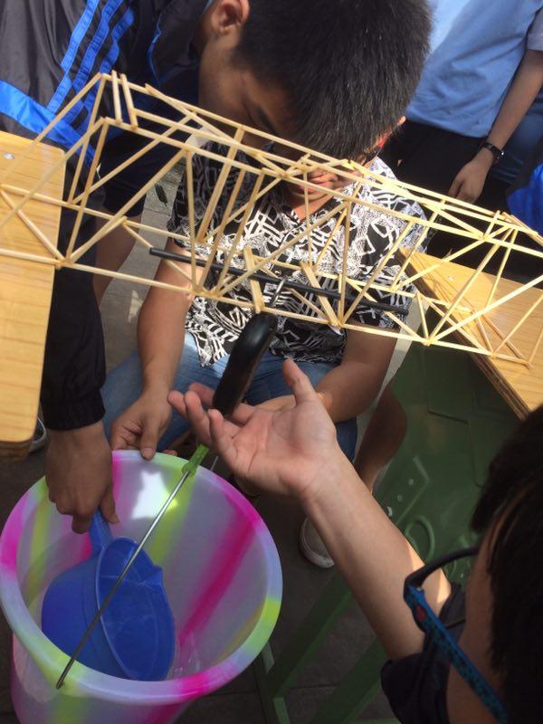 2017年6月1日,我校第十届科技节创意大赛——桥梁承中比赛在英语角进行。比赛中,同学们积极发挥自己的创意,用一根根小木棍制作设计出了各式各样的桥梁模型,有梁式桥、拱式桥、悬索桥、斜拉桥、刚构桥和组合体系桥。本次活动丰富了同学们的课余生活,也培养了同学们的创造性。