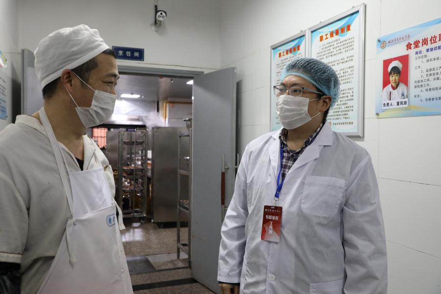 小学驻校家长在与食堂厨师长仔细交谈。