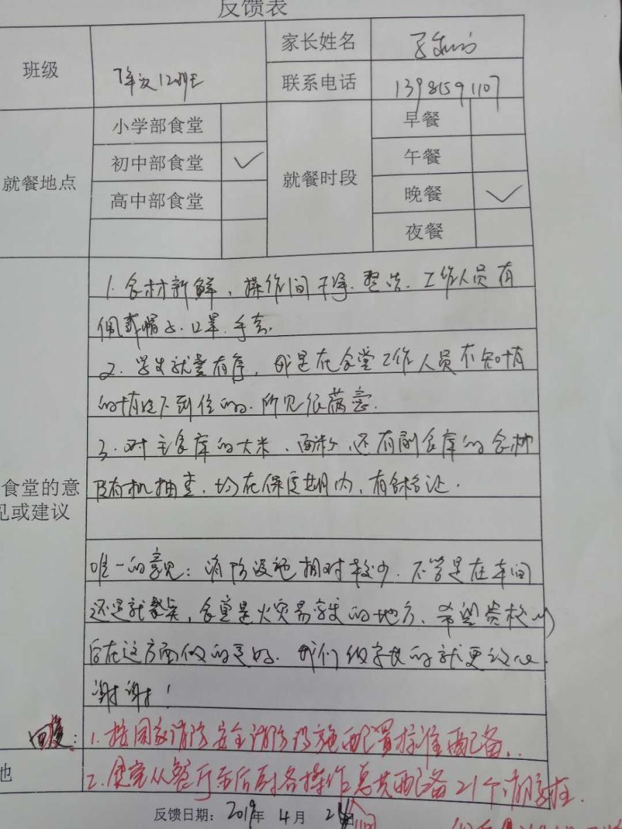 四月,食堂继续接待了来参观的初中和小学的家长,小学驻校家长每天不定时进入食堂,初中家长是自己选择时间来参观。参观后,家长们都在意见反馈表上留下了宝贵意见,同时也对食堂工作给予了充分肯定。家长们提出的以下意见已经整改到位:1、毛巾要分类使用。2、食堂增加防滑提示。3、切水果员工要戴手套。4、食堂增加灭火器。下面,我们用图片介绍食堂的情况,让大家了解食堂的加工环节。