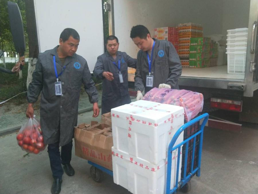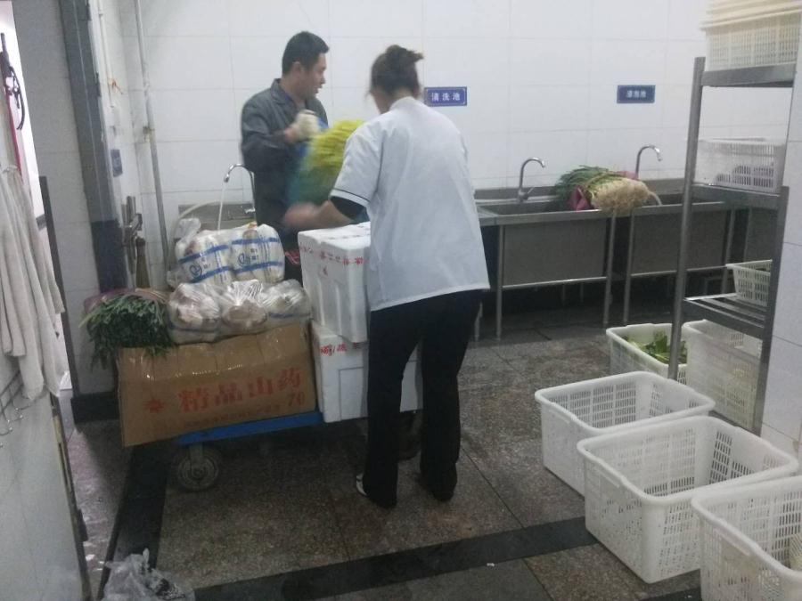 食堂工作人员验收食材。