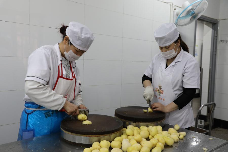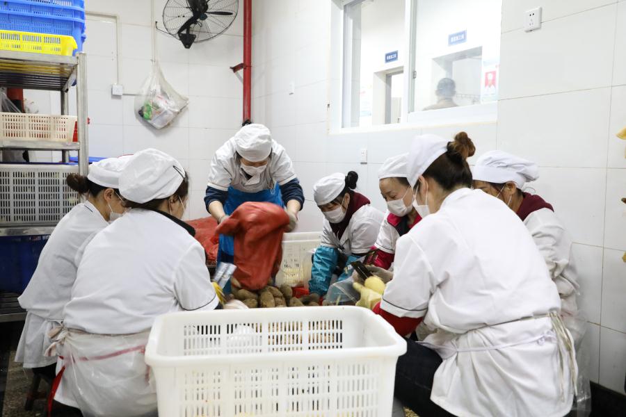 蔬菜加工间里员工正在切土豆花。