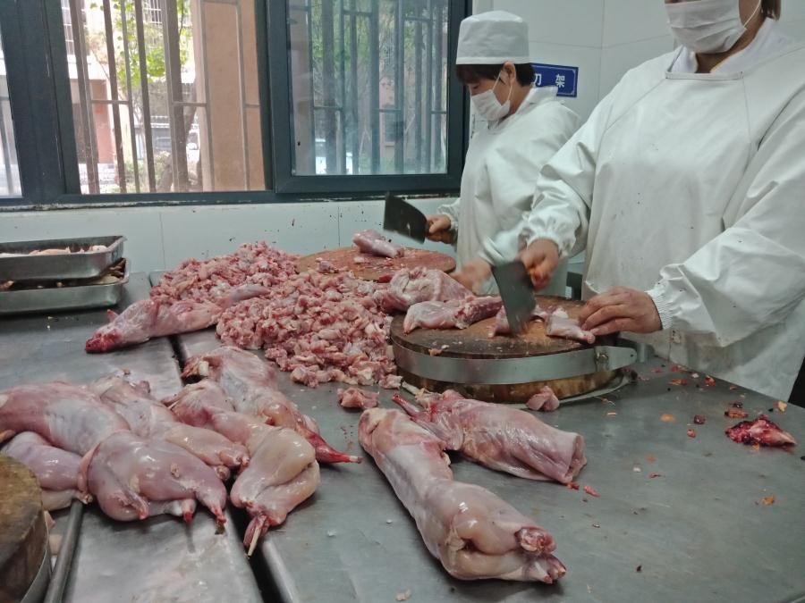 肉类加工间里员工在加工新鲜的兔肉。