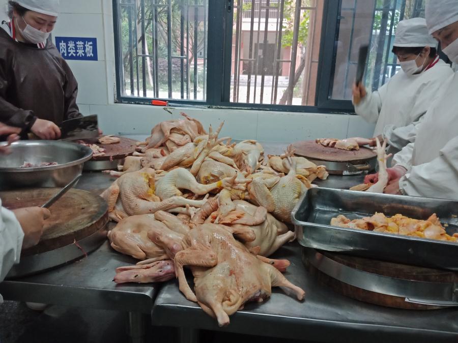 肉类加工间里员工在加工新鲜的鸡肉和鸭肉。