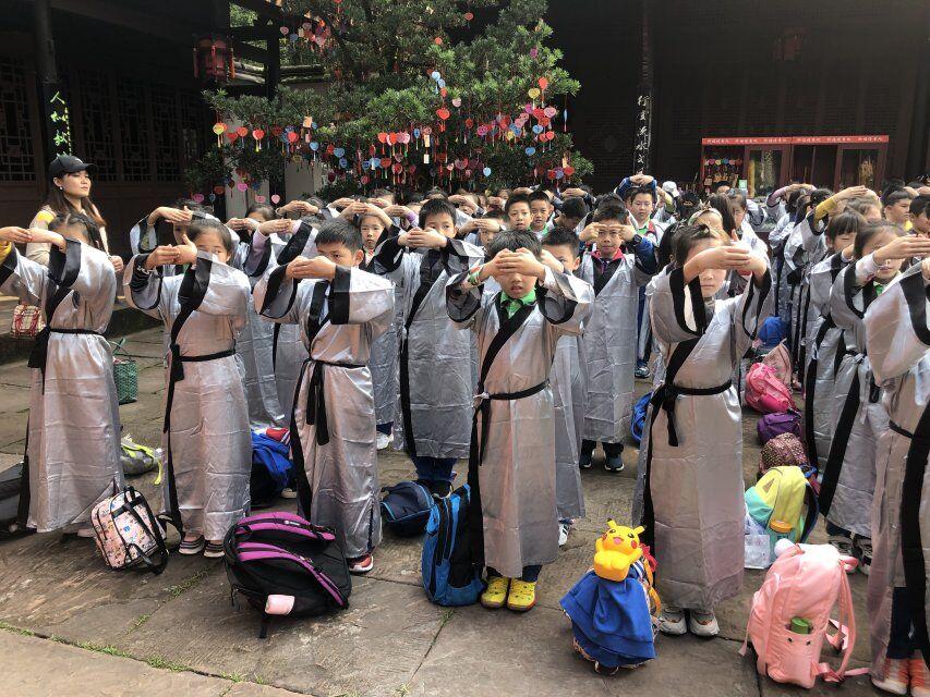 行至正殿外,孩子们身着国学服,和老师们一起吟诵经典。一曲《水调歌头》,让我们的思念穿越古今;一首《定风波》,把我们豪情定格在眉州。一场简单而祭拜,让我们在实践中知、行、研、悟。