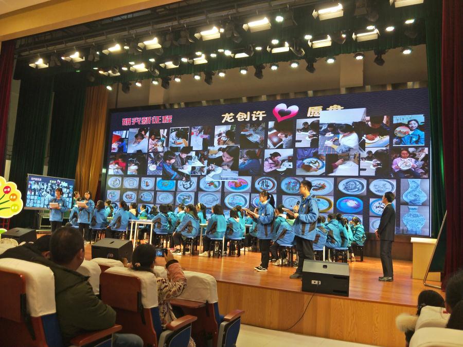 首先张玉萍、徐然两位老师带领七年级一班的同学们带来了一堂跨学科外出综合实践活动成果展示课——《龙文化与黄龙溪》。课题探究基于双流本地旅游名片——黄龙溪,问题来源于学生真实的生活情境。学生分为寻龙组、导游组、创意组,大家从自己感兴趣的问题出发,选择并成立子课题。同学们在合作中设计方案,按计划有效实施,在实地考察中不断发现问题。四川师范大学民俗文化专家黄尚君教授的指点更是让同学们实践的脚步更加坚定。创意物化——小小的龙盘,或寄托理想,或感恩致谢。在设计制作过程中,动人的故事一次次打动着与会老师,做好龙的传人,传承龙的精神成为烙印在学生心中最深刻的领悟。