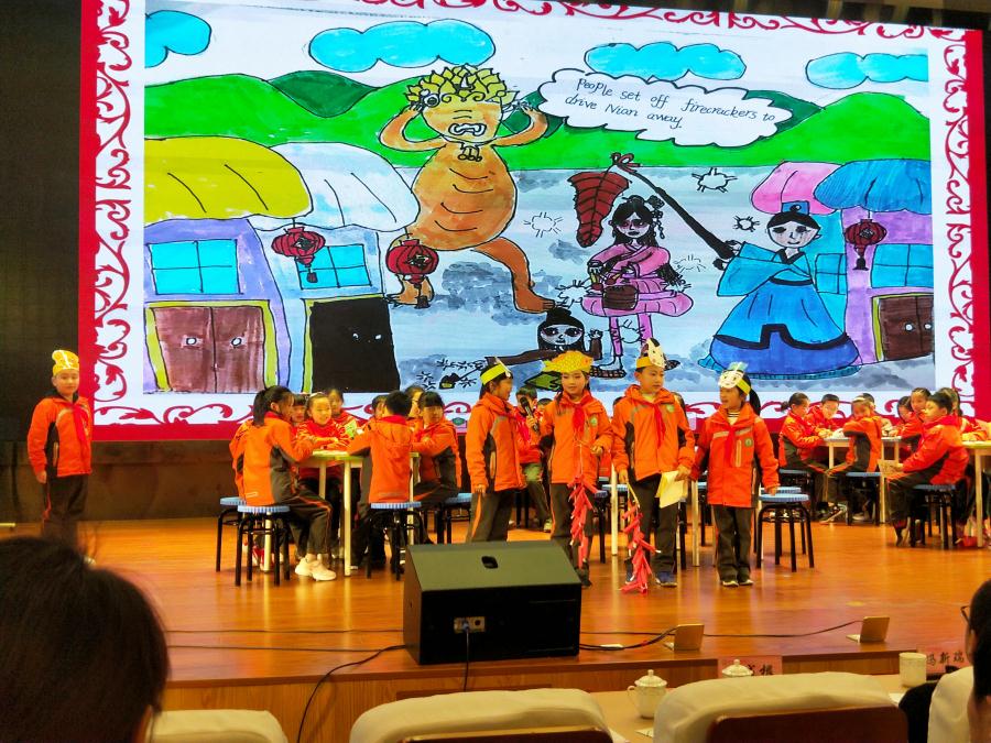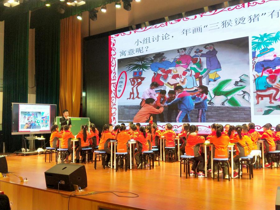 最后,附小廖进欢老师带领附小三年级学生为大家呈现了一堂精彩纷呈的成果交流展示课——《走进年画村》。廖老师基于研学旅行中孩子们的直接经验,密切联系孩子的生活实际,创设情境,引导孩子通过考察探究,体验操作,查阅资料等方式,了解博大精深的年画文化,挖掘年画文化的精髓,培养学生发现问题、解决问题等综合实践能力。课堂上孩子们或侃侃而谈地表达,或惟妙惟肖地表演,一堂丰富多彩的综合实践汇报课,让学生不再局限课本上的知识,而是走出去与生活接轨,与传统文化接轨。