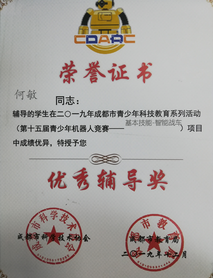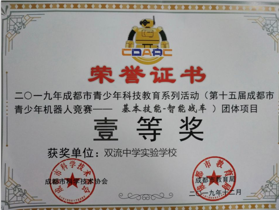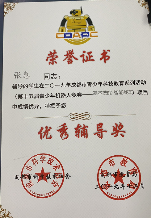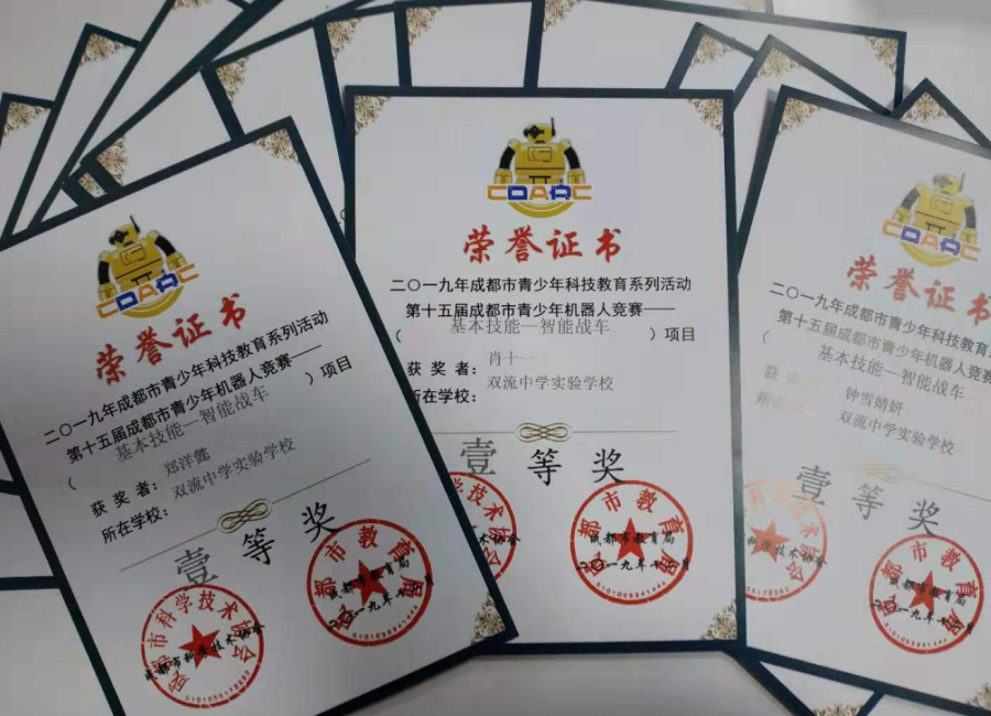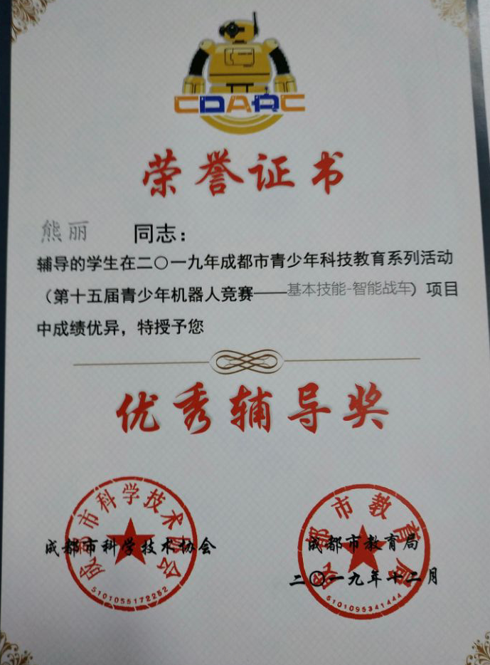 为进一步提高我市青少年科技学习水平,培养青少年的科技创新 精神和动手实践能力,鼓励广大青少年科技爱好者在信息、智能控制 等领域进行学习、探索、研究和实践,激发他们对科学的兴趣,提高科学素质,成都市科协于本学期在全市范围内开展成都市青少年机器人基本技能项目竞赛活动。我校在熊丽、张惠、何敏三位信息技术老师的带领下,在二三四年级组织学生参与了本项目的比赛,共有78名学生获得成都市一等奖,三位信息技术老师获优秀辅导奖,学校获得团体一等奖。