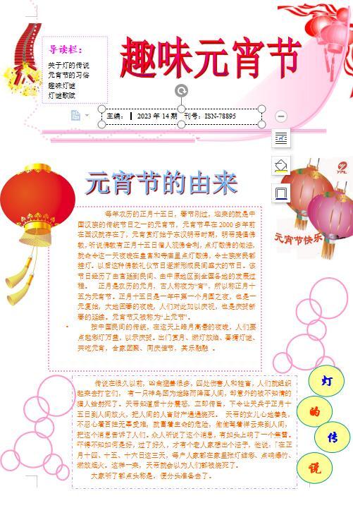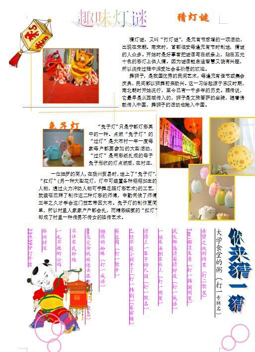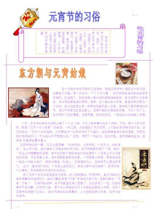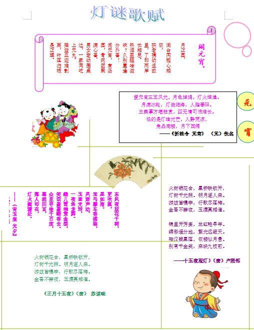 本作品的创作思想(创作背景、目的和意义)是为了宣传元宵节的传统节日的,按中国民间的传统,在这天上皓月高悬的夜晚,人们要点起彩灯万盏,以示庆贺。出门赏月、燃灯放焰、喜猜灯谜、共吃元宵,合家团聚、同庆佳节,其乐融融 。我们的创作过程 利用了word中插入文本、艺术字、图片修饰、版面设计等技巧来对文字和图片进行排版和修饰、美化,还用到图片处理软件对图片进行调整和美化,整个作品颜色清新、大气,排版布局合理,按照元宵节的各个内容版块来制作。