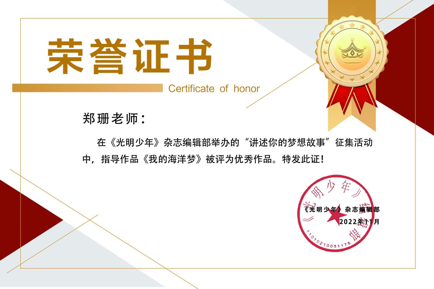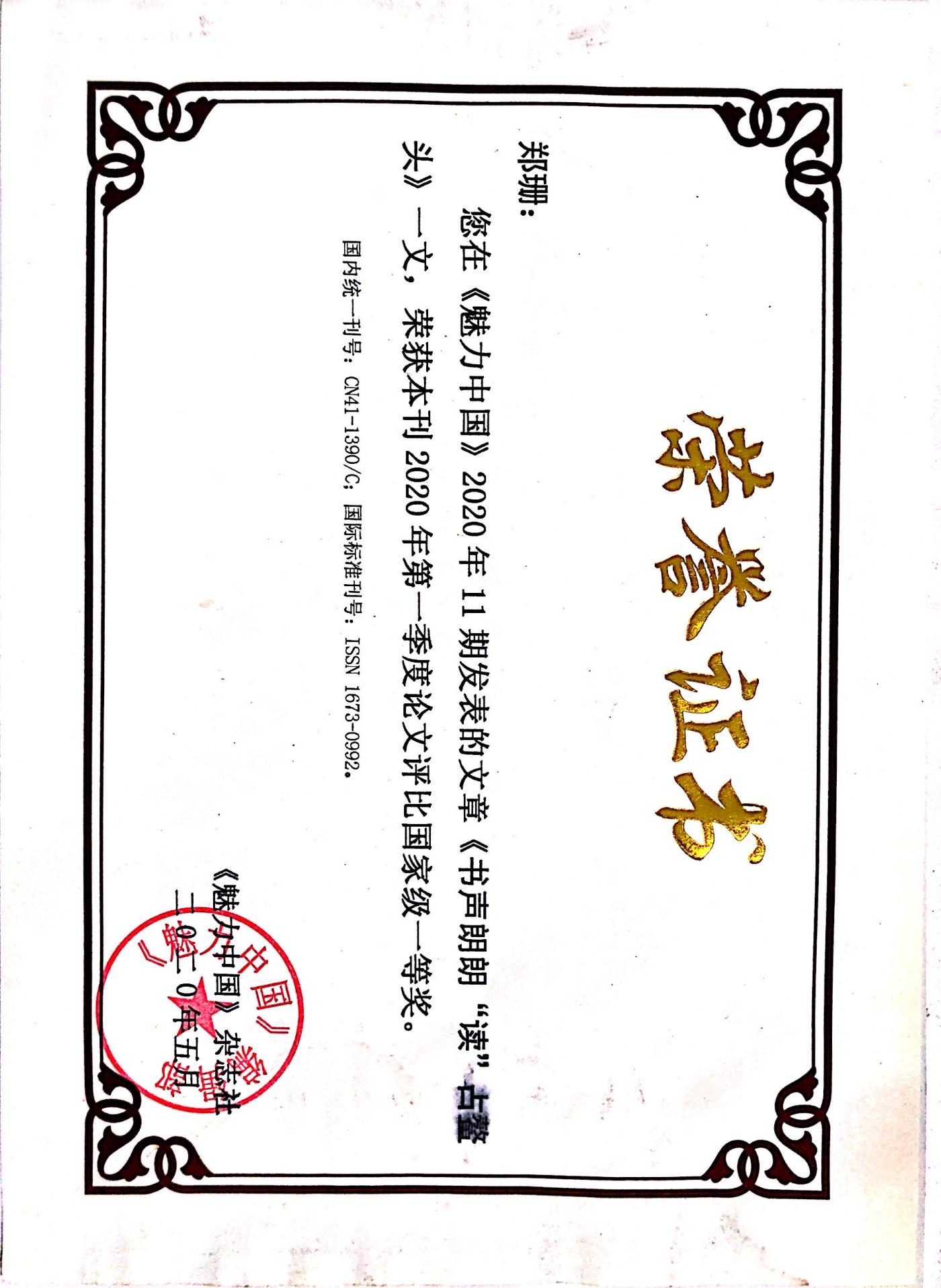 在执教生涯中,郑老师多次参加区内公开课和竞赛评比,获得一致好评并多次获奖,其中《“精彩极了”和“糟糕透了”》获得全国名师工作室教学设计一等奖。