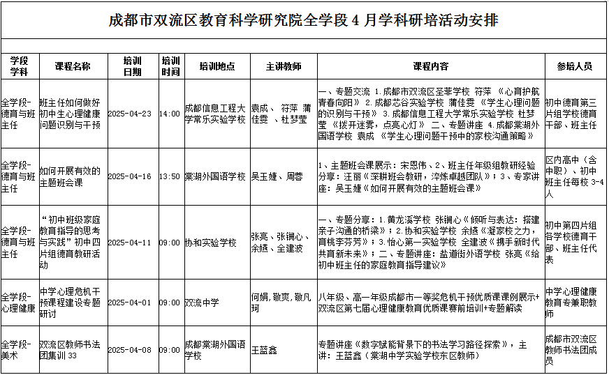 成都市双流区教育科学研究院全学段4月学科研培活动安排