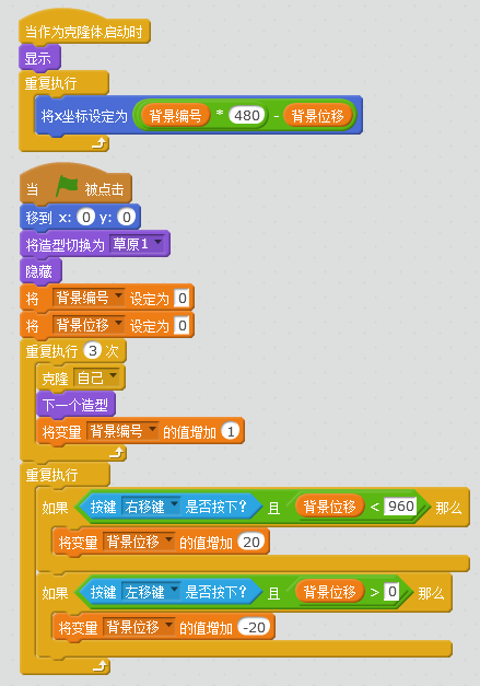 该代码将四张背景图片拼接起来,扩大了Scratch的背景,依靠背景的移动,给人造成目标前进或后退的效果,以下代码为按键时背景移动的代码: