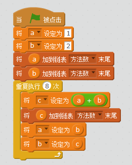 以下为用Scratch实现的统计走楼梯方法数程序,并将结果用链表记录显示出来!
