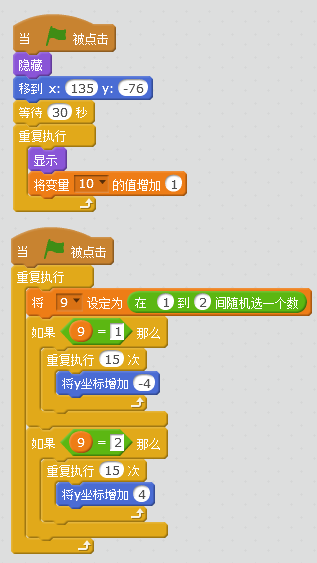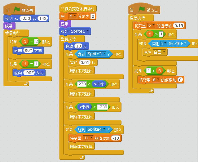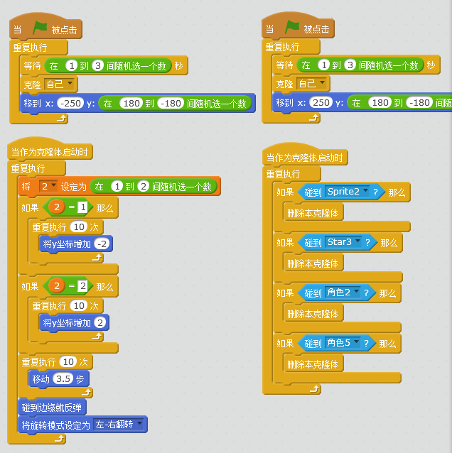 这是我本学期参加Scratch选修课后,自己设计制作的第一个游戏,请大家多多指教!以下为部分游戏角色代码: