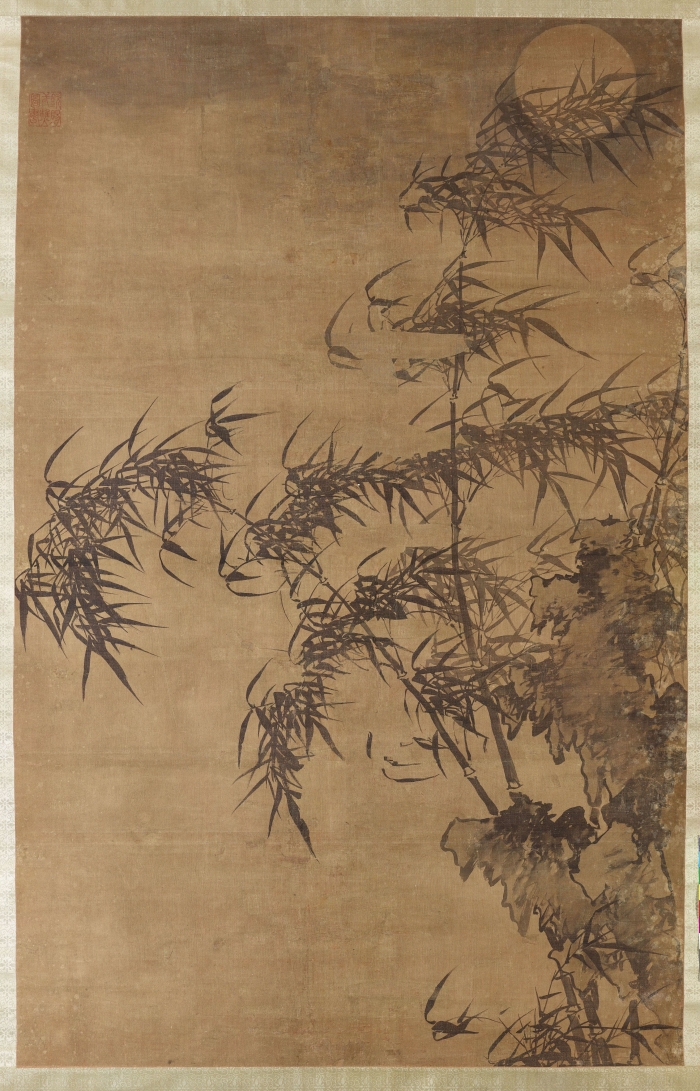 此幅无款,只钤有”钦赐一樵图书“一印,此印文是朱端入奉内廷后皇家所赐号。图中所绘湖石与其画山水笔法同,墨竹学夏昶,用笔稍纵逸,一轮明月挂竹梢,更显意境清幽。