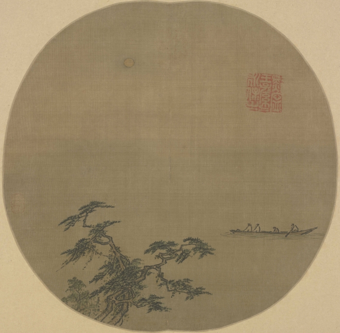 绘月圆之夜江上游船之景,画面近端几杆松枝入画,枝壮叶茂;江面水平如镜,宽阔无边;浩月当空,夜空中照亮着江中小舟前行。全图大部分空白,却达到了烟波浩淼,水天一色之意境。