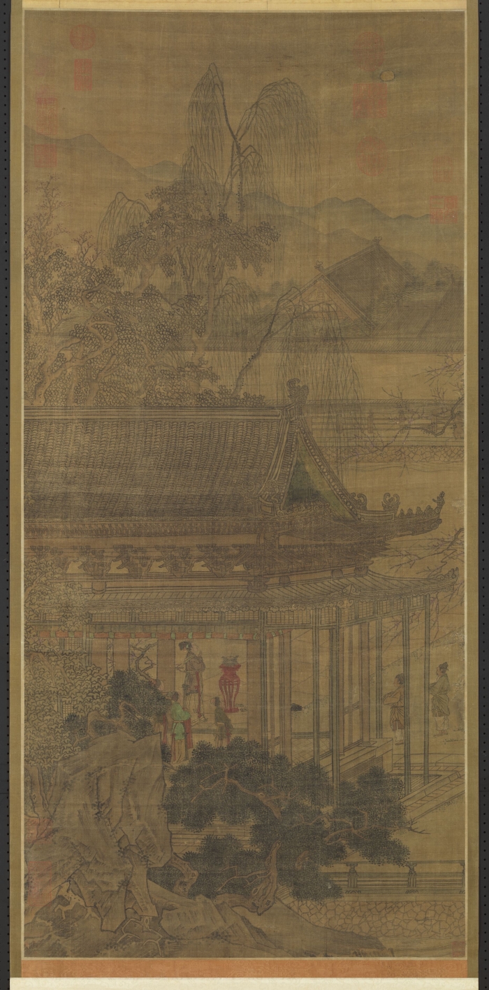 图绘素月流天,华堂四敞,焚香敛袂,姬侍盈前。堂后楼榭参差,风柳露桃,高下掩映。