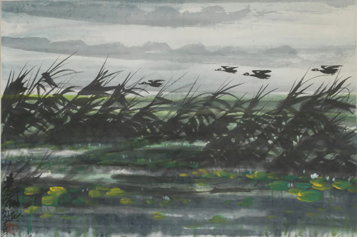 展览展出的芦苇飞鹭系列作品是林风眠二十世纪五六十年代的常见主题,“芦苇、飞鸟、堤岸、远山”这些西子湖畔的典型物象,共同组成了林风眠对于江南地区的视觉记忆。他对于江南地区的风景画创作并非面对自然的对景写生,而是多年记忆的映射,他强调的是艺术家本人在面对大自然时内心最真实的感受,是自我对景物的感知与本能的领悟。