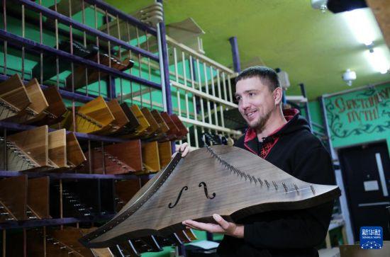 10月14日,在俄罗斯西北部特维尔州普希金诺村,“古斯里琴世界”工坊的创建者谢尔盖·戈尔恰科夫展示其制作的古斯里琴。新华社记者 孟菁 摄
