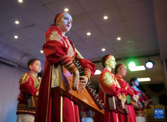 10月14日,在俄罗斯莫斯科州“库皮纳”古斯里琴艺术发展中心音乐厅,“库皮纳”儿童古斯里琴演奏艺术团的演员正在表演。新华社记者 孟菁 摄