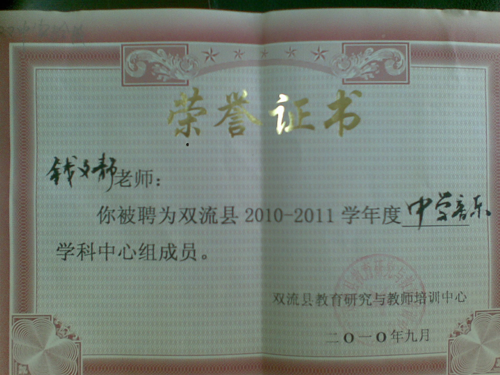 2010年9月被聘为双流县“中学音乐学科中心组成员”;
