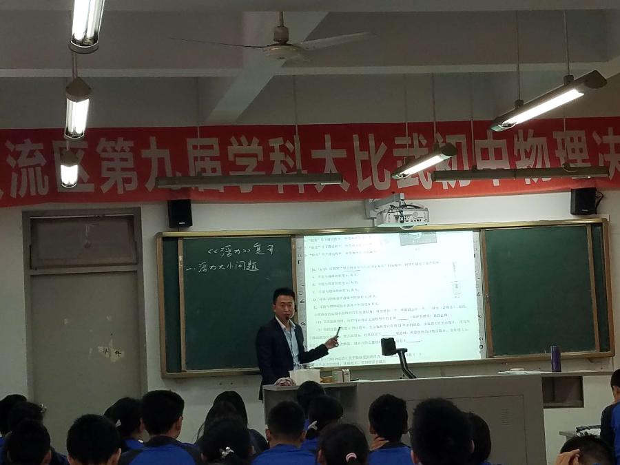 第二天的比赛中,我校的何铁老师出场。他抽到的题目是《浮力复习》。他课堂调控能力强,能灵活根据学生的回答正确引导,并使用良好的激励语言,激发学生求知欲。对学生情况了解透彻,为引导学生主动复习知识打下了良好的基础,做到了有的放矢。