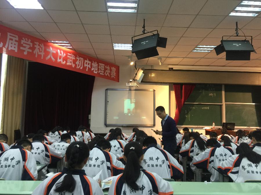 按照抽签顺序,我校王俊老师作为第二位参赛选手上场,以《简要分析某国如何因地制宜发展农业——以美国为例》为题,设计的课堂气氛时而高涨时而安静,学生兴趣浓厚,教学形式多样,利用挂图、小组讨论、代表发言、自主学习、小游戏等形式抓住学生眼球,利用平时扎实的教学功底与学生合作完成,符合学生认知规律,将课堂教学模式灵活运用,设计理念出新出彩,特别让在场专家和评委眼前一亮的是王老师用直播手段展示学生成果,获得评委和观摩教师的一致好评,总分暂居第一。 其他决赛选手如罗媛媛、陈苹等语言流畅,抑扬顿挫,节奏性强,板书有条理,规范漂亮,字迹工整,科学规范,重点突出。