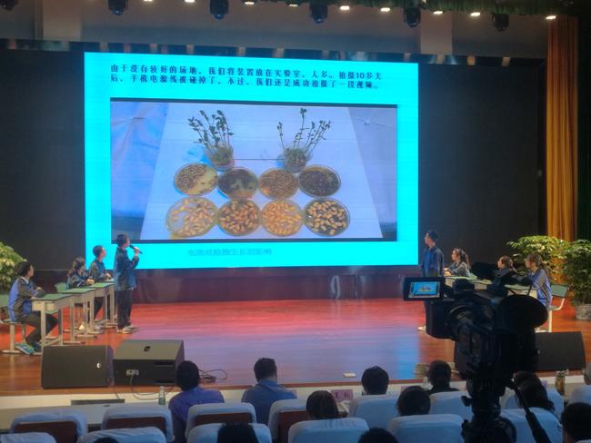 第二个汇报的是《废旧手机现状调查及再利用研究》。该课题由王伟、李春燕、罗远均三位老师指导。该课题从“废旧手机废弃的原因和现状、废旧手机可能造成的危害及如何科学处理、如何拓展废旧手机的再次利用的价值”三个方面进行研究。通过用清水和手机电池电解液浸泡的黄豆、绿豆发芽情况对比,对豌豆苗生长的对比,直观地展示了手机电池的电解液对植物生长的明显负面影响。而对废旧手机功能的再次开发中,同学利用废旧手机自己设计方案,成功的完成了3D拍摄和延时摄影,精彩地展示了废旧手机的再次利用。学生汇报完成后,由罗远均老师代表三位指导教师现场点评。罗老师表扬了同学们为了保护环境、节约资源而做出的努力,同时也对同学们后期的研究提出了建议。