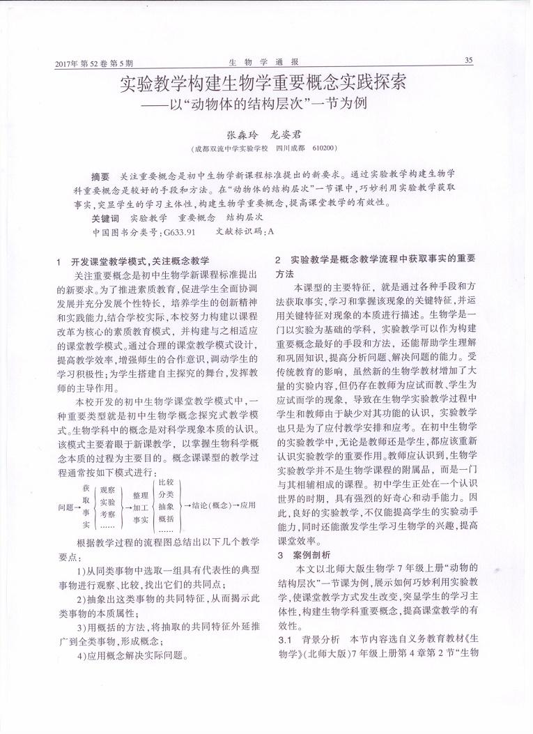 热烈祝贺我校张淼玲、龙姿君两位老师的论文《实验教学构建生物学重要概念实践探索——以“动物体的结构层次”一节为例》,在《生物学通报》2017年第5期教学实践与交流栏目发表。《生物学通报》是由中国科学技术协会主管,中国动物学会、中国植物学会和北京师范大学主办的全国生物学类核心期刊。