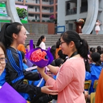 花儿的成长离不开园丁的栽培,学生的成长离不开教师的付出。面对又一届优秀的毕业生,教师代表干敏老师有些心里话要说。干老师带着学生回忆着这三年,一千多个日子啊,快乐而难忘。当初,满脸稚气孩子们的进入新的校园,懵懂无知,各种调皮捣蛋;现在,学生们学业有成,为了美好的未来而奋斗着。干老师对学生们说:知道吗?老师们貌似严厉的外表深处,对你们充满了喜爱与欣赏:知道吗?老师们以你们为自豪!谁不爱自己用心血灌溉的小树苗呢?更何况你们茁壮地成长着,由嫩软到硬朗,由细弱到刚强,长出了力量,焕发出向往蓝天的美好憧憬。严厉只是老师的外表,内心都是对学生满满的爱。场下学生无不被干老师质朴而深情的话语感动。师恩难忘,师恩,永不忘!为了让学生也表达对老师和学校的感恩之情,本次毕业典礼新增了为教师鲜花环节。各班学生代表在学生的阵阵欢呼声中,走向教师就坐区,为本年级90多名教师献上鲜花,略表对老师的谢意,随后的学生代表发言朴实无华,忆往昔、谈人生,表达了对学校的留恋和不舍。场面温馨动人,部分师生泪眼朦胧,掀起了活动的小高潮,充分体现了毕业典礼感恩的目标。