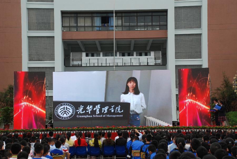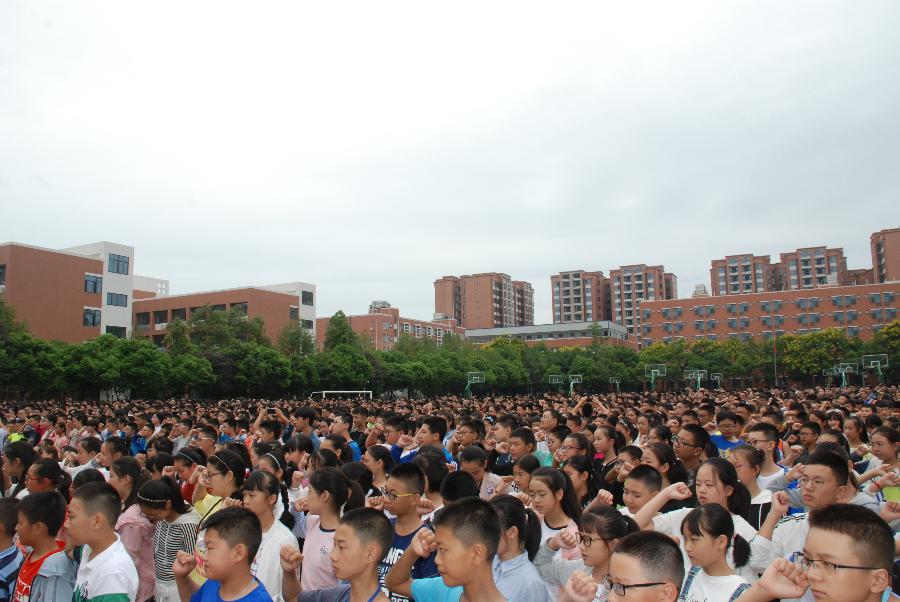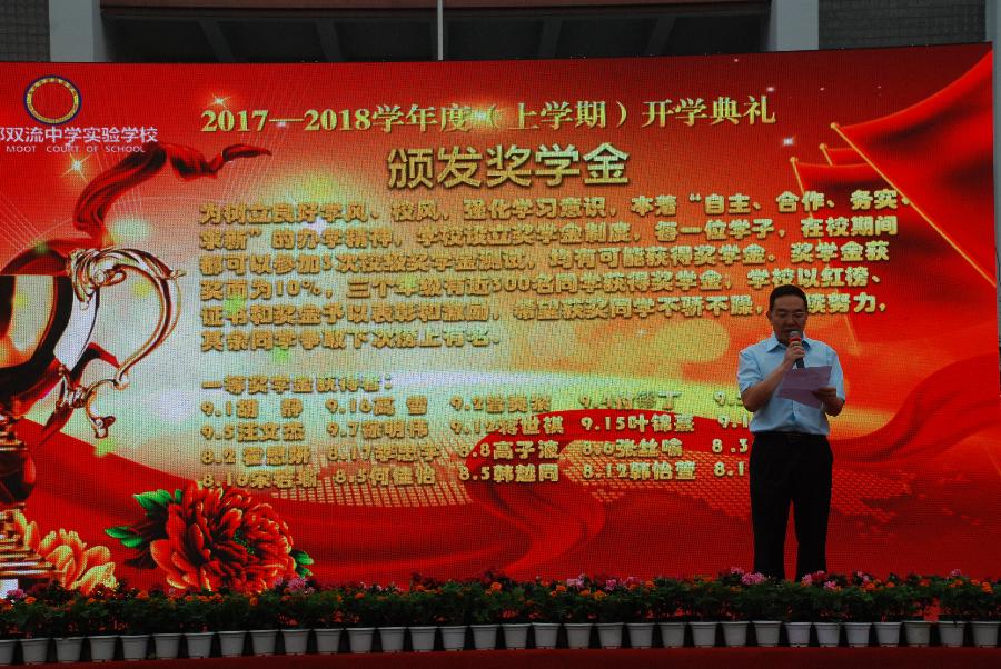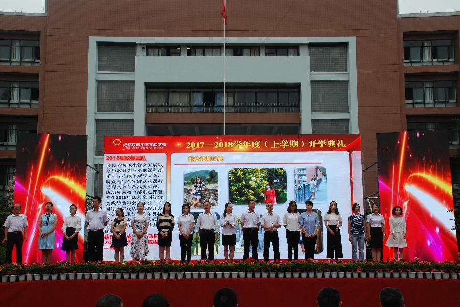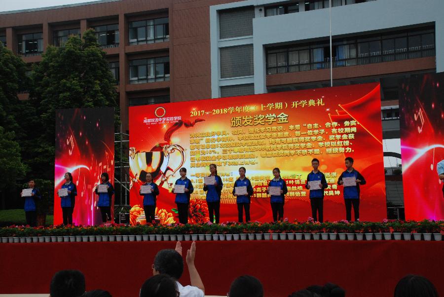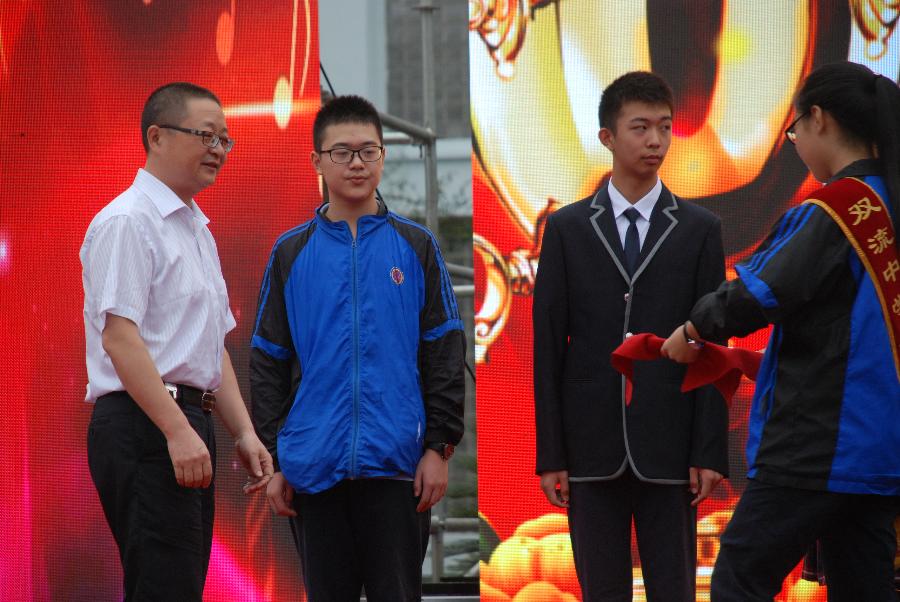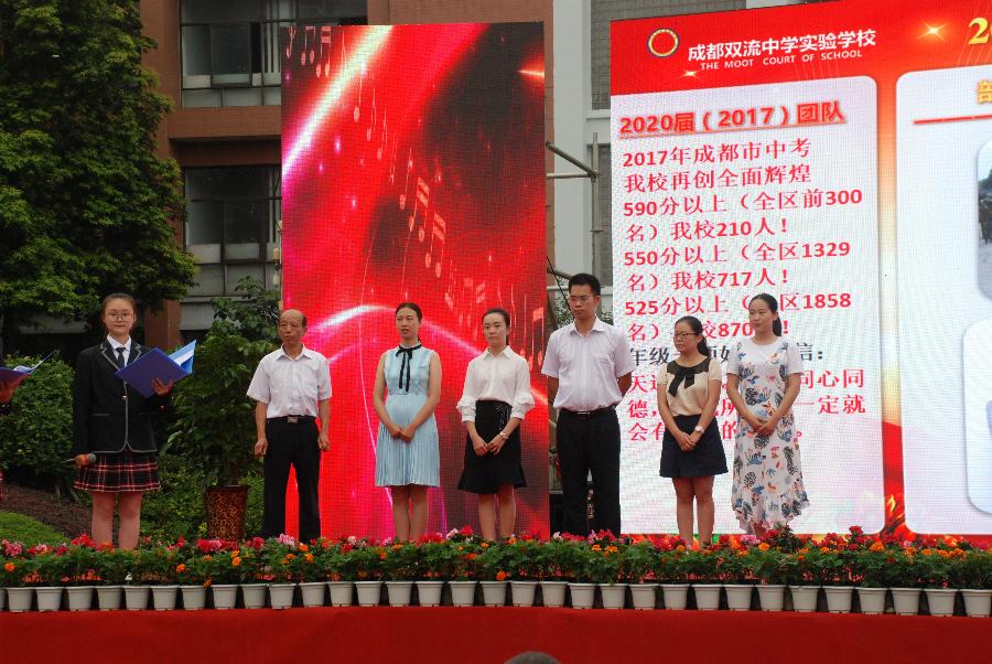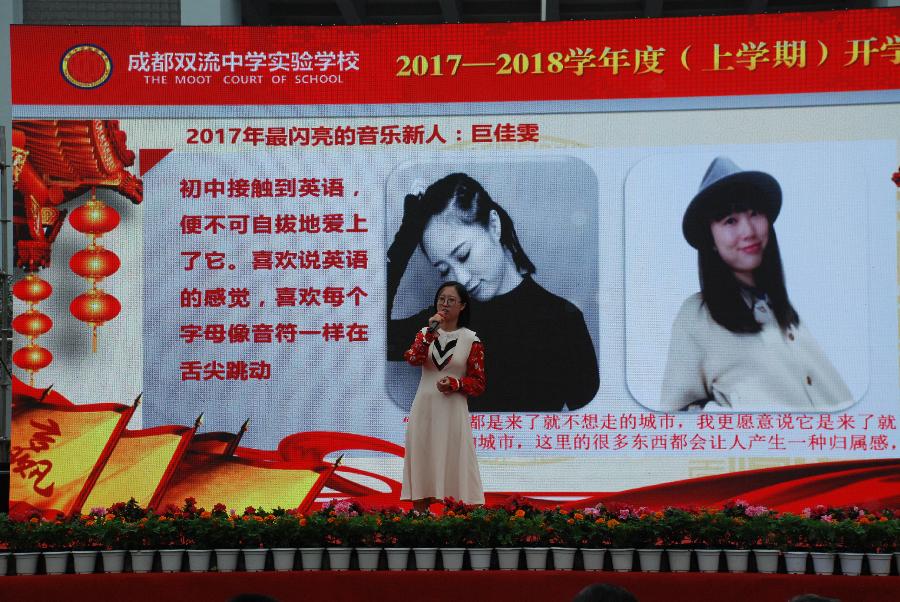 风在宁静时是无言的,那么就让我们的心跑动吧!当年轻的心为理想而跑动时,风就有歌了。水在静止时是无言的,那么就让我们的血液奔流吧!当他为梦想奔流时,水就有歌了。山是沉默的,那就让我们沿着前行者的脚步攀援吧!那拓荒者的脚步与回声便是对我们内心信仰的忠诚回应! 执着前行十四年,双中实验涌现出了众多的优秀学子,今天,2012届优秀毕业生代表,现北京大学大三学生徐洁敏,2017届双流区中考第一名汪潇潇同学通过视频连线的方式带来了她们对母校,对老师,对学弟学妹们深深的祝福。2007届优秀毕业生代表,2017年最闪亮的音乐新人巨佳雯更是带着她的原创英文歌曲回到母校引吭高歌。而全体同学则以最热烈的掌声表达了他们对于学姐们的深深的敬意。