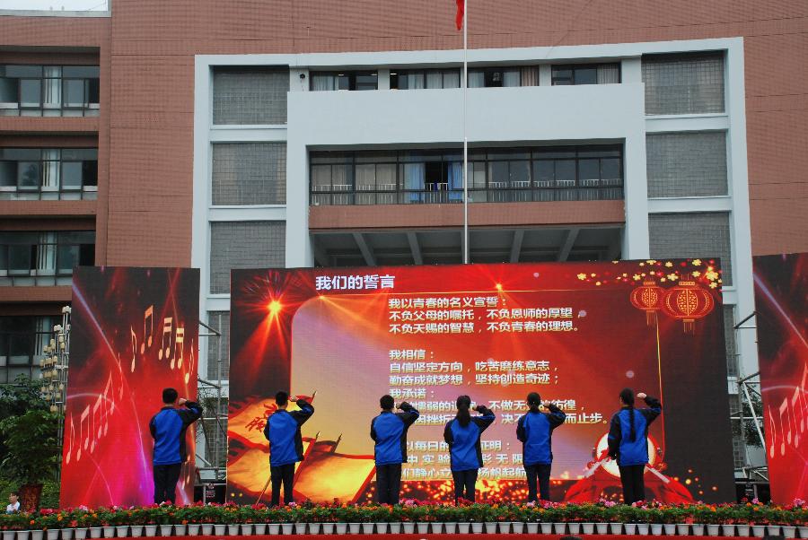 在青春的舞台飞扬,在人生的驿站成长。挥洒青春 ,用生命抒写人生的故事。铿锵的誓言将引领我们迈向卓越的未来。全体学生宣誓将整个典礼推向了高潮。