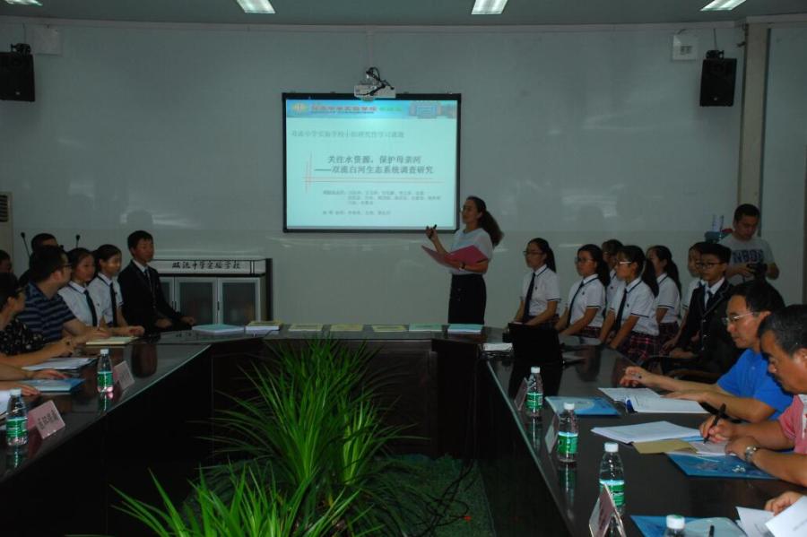 2009年,《关注水资源,保护母亲河——双流区白河污染调查及治理措施研究》的课题应运而出。在课题指导老师李春燕等的指导下,已有三届学生对白河近9年的改变和现状进行调查和探究。在本次调研中,本届课题组学生首先向莅临学校的各位领导作了近几年的课题成果汇报。短暂的汇报,再现了研究的过程,学生谈到,从最初到现在,看着母亲河环境日益变好,他们觉得很兴奋,他们更享受课题研究的整个过程。正如孩子们所说,他们是来自不同地区的孩子,却做着同一件事情——为保护我们的母亲河贡献自己的微薄之力,接着,指导老师李春燕汇报课题组自09年至今调查研究白河水环境情况,在这一过程中,李老师提到非常感谢各部门对课题的大力支持,也非常感谢在课题研究过程中水务局对我校课题所提供的帮助。正是因为有了各相关部门、专家的帮助和支持,有了双中实验以及这群愿意付出和思考的学生,我们的明天会更美好。