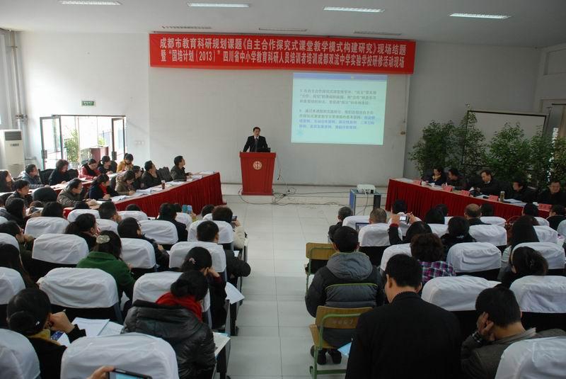 2013年11月27日上午,星空在线登录官网承担的成都市教育科研规划课题《自主合作探究式课堂教学模式构建研究》现场结题暨“国培计划(2013)”四川省中小学教育科研人员培训者培训研修活动在成都星空在线登录官网隆重举行。来自全省各地的科研骨干360余人参加了本次活动,四川省教科所吉文昌所长,四川省教科所科研管理室王真东主任、青春主任,成都大学周小山教授、四川师大教师培训学院副院长曹正善教授、成都市教科院教育改革发展研究所胡燕所长、双流县研培中心理论室易恩主任等领导和专家莅临现场指导工作。星空在线登录官网副校长张润林、王伟等领导和课题组主研教师参加现场结题会。
