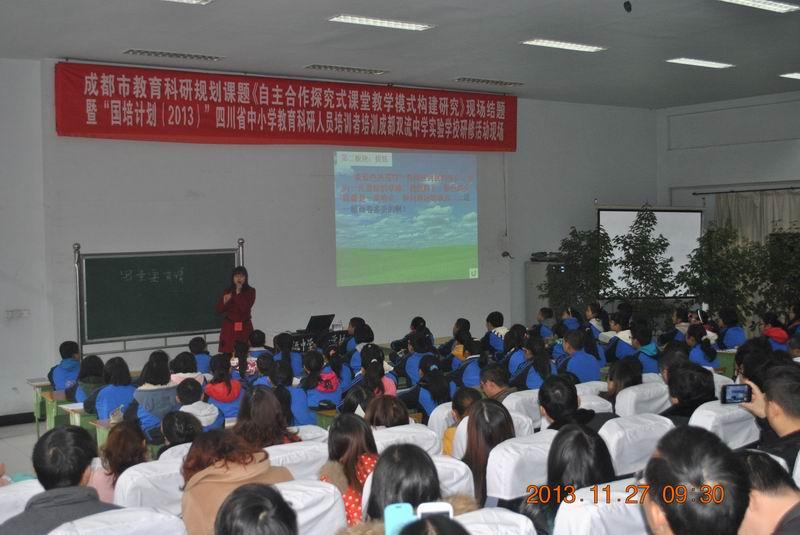 星空在线登录官网承担的成都市教育科研规划课题《自主合作探究式课堂教学模式构建研究》现场结题暨省级展示交流活动,为“国培计划(2013)”四川省中小学教育科研人员培训者培训高级研修班学员提供了一次很好的观摩学习机会,在全省较大范围推广了该课题研究成果,受到专家和同行的好评,发挥了示范引领作用。