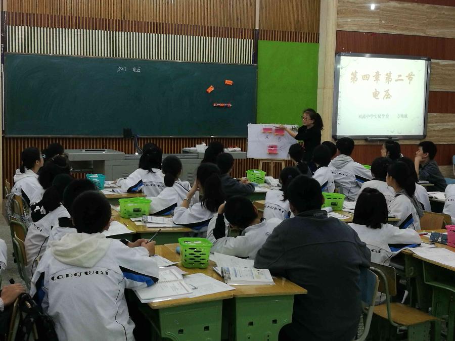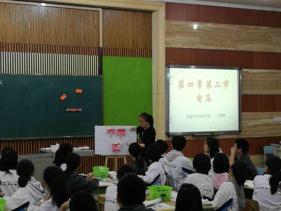2017年11月2日,双流区物理教研会在棠湖中学外国学校召开,我组教师方艳秋老师在会上献课,她献课的题目是《电压》。方老师利用自制的教具,巧妙的由水压类比到电压,使学生理解了这一抽象的概念,突破了教学的难点。在电压表使用的教学中,方老师充分发挥了学生的主观能动,由学生根据已学过的电流表的使用方法推测电压表的使用方法,并对比相同点和不同点,获得了与会老师的一致好评。评课结束后,区教研员韩军老师作了精彩的点评。