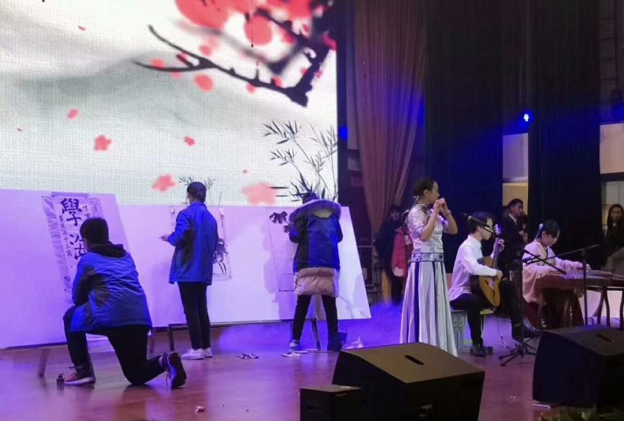 首先,打击乐团以强劲节奏迅速点燃全场,掌声、欢呼声不绝于耳;随后,英语歌曲串烧、诗朗诵、校合唱团、相声、校园剧 各种精彩节目相继闪亮登场,或婉转悠扬、或慷慨激昂,各路“豪杰”才华尽显。现场书画笔走龙蛇,配乐表演相得益彰;更有新疆舞、当代舞、声乐串烧、英语教师表演唱等节目,惊喜不断。一个个精心准备的节目,引人入胜,高潮迭起,一场悦人耳目的视听盛宴伴随现场观众度过一段愉快的周末时光,也把师生们多才多艺的风貌展现得淋漓尽致。