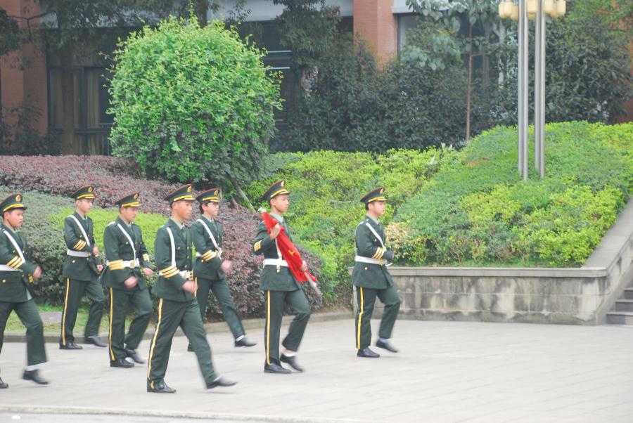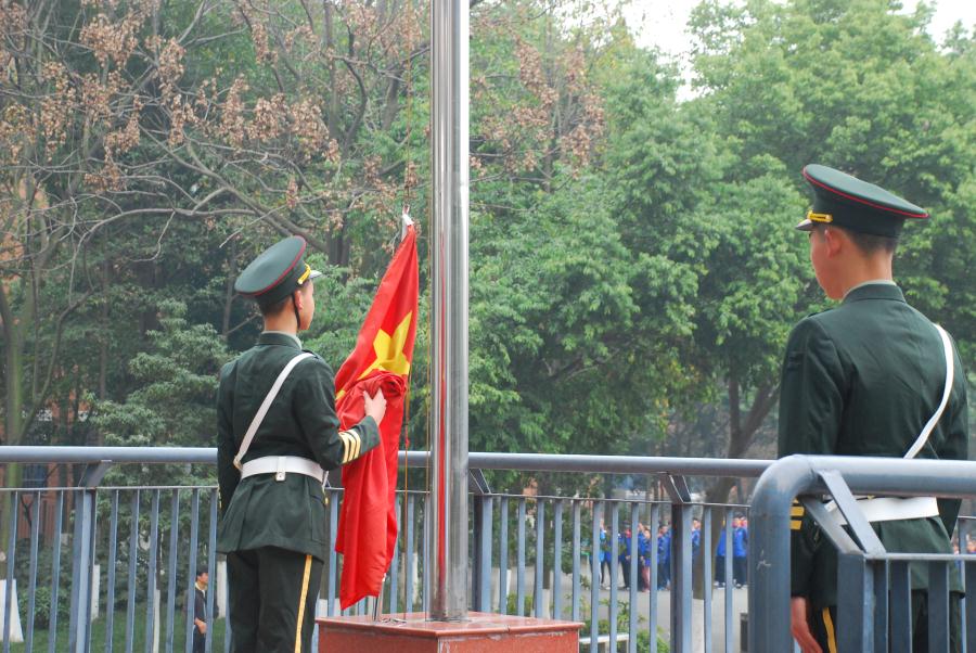 在庄严的国歌声中,国旗班队员们精神抖擞,迈着正步行进到旗杆前。随着一声洪亮的“敬礼”口令,升旗手拉动滑轮,擎旗手挥动右手,划出一道优美的弧线,在全校师生的注视下,鲜艳的五星红旗沿着旗杆冉冉升起。