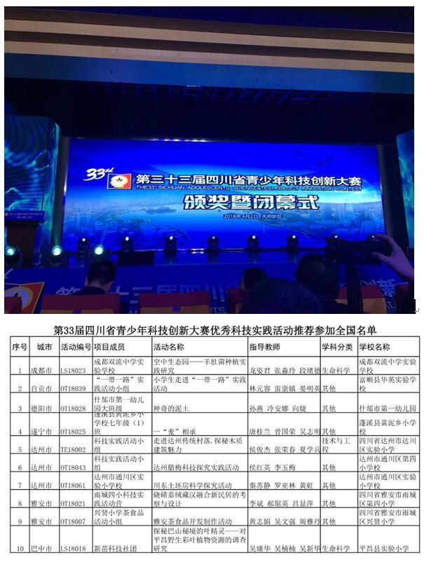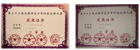 2018年3月30日—4月2日,在华阳中学举办的第三十三届四川省青少年科技创新大赛中,我校龙姿君、张淼玲和段绪德三位老师指导的科技实践活动 《空中生态园——羊肚菌种植实践研究》荣获优秀科技实践活动四川省一等奖第一名。作为成都市唯一一个科技实践活动被推荐参加第三十三届全国青少年科技创新大赛。