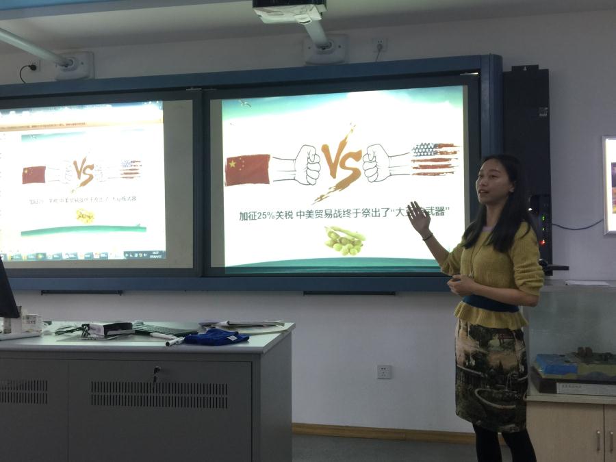 丁翔老师4号出场,首先以热点问题中美贸易战展开“运用地图和其他资料,联系某国家自然条件特点,简要分析该国因地制宜发展经济的实例——以美国农业和经济为例”学习,其次迁移印度认识美国农业带分布与自然条件有关系,随后小组活动展示美国不同区域自然条件优势,最后通过多媒体资料认识美国农业带分布特点,点题美国因地制宜发展经济。教学过程环环相扣、层层推进,以学生为主体,让学生充分参与整个教学过程,有效体验整个学习过程,较好的体现了自主、合作、探究的理念,获得在场评委和老师的阵阵好评。