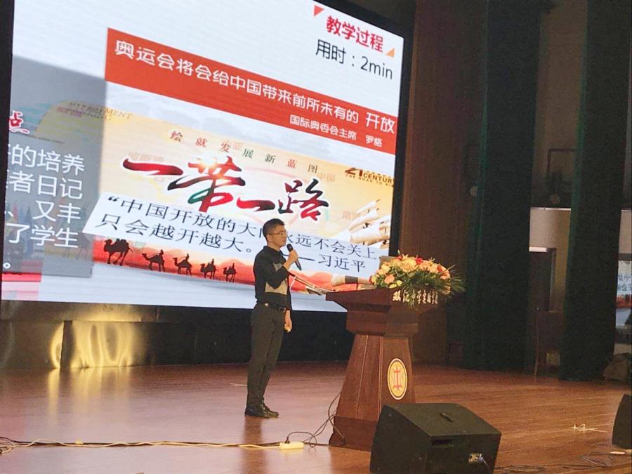 本次活动共有29位参赛教师,大部分来自成都市、区、县传统名校,皆是经过层层选拔涌现出的顶尖选手。我校赵鹏飞老师的说课课题——《百年奥运梦想的实现》,以健全人格要素中“坚持与坚定”为课魂,以中国奥运第一人刘长春为切入点,以奥运为明线,国运为暗线,现代信息技术完美融入课堂教学,赢得七位评委的一致认同。在29名选手中脱颖而出,以92.4分获得说课特等奖第一名,成功进入赛事讲课环节。
