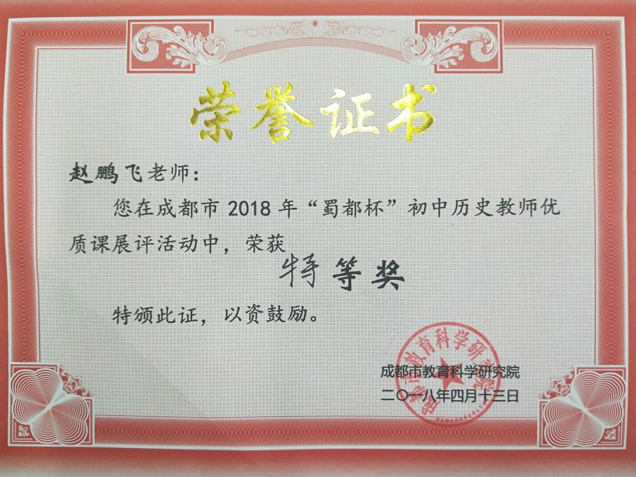 实践是检验真理的唯一标准,教学设计只有放到课堂之上方可检验其成效。入围最终讲课环节的9名教师,尽其所能,深入挖掘教材,着眼历史细节,展现了成都市初中历史教学的顶尖水平。赵鹏飞老师以近代中国人的奥运梦串联本课,讲述几代人的奋斗史,以极具感染力的数字故事、时间轴等方式辅助教学,引导学生突破重点,指明国运昌则奥运强。与其他8名选手的激烈角逐,以92.1分再次获得讲课比赛第一名,印证了我校开展精品课程建设,强调团队合作的做法是行之有效的。因为在本次活动中表现出良好的课改风貌、科研能力、团队素质,历史组被成都市教科院评为成都市优秀教研组!
